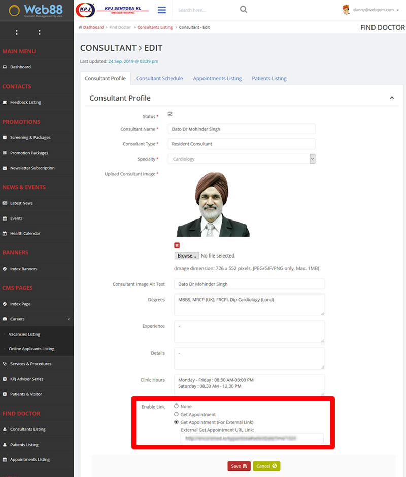 KPJ Sentosa KL Hospital Web88 Administration Panel: Doctor "Get Appointment" Link Setup