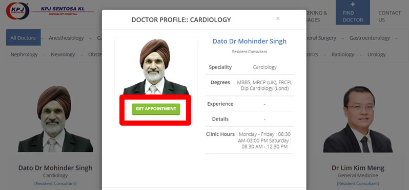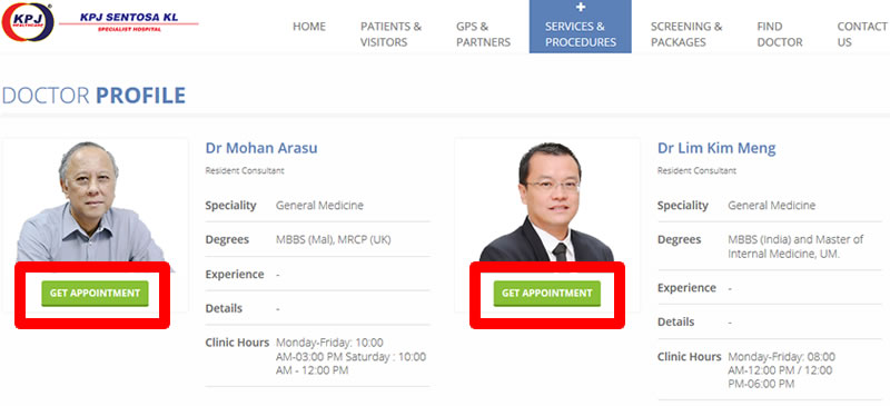 KPJ Sentosa KL Hospital website: Doctor "Get Appointment" Link